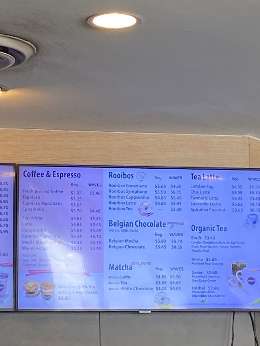 “ I love this Waves location. Once or twice a week enjoy a London Fog made with oat milk and half sweet. I always get prompt, friendly service, and more hot water in my cup when I ask. It is a warm, friendly atmosphere, with nice but non-obtrusive music and friendly clientele. Lots of space so you can sit and read or write or study--on paper or on laptop! This is my favourite neighbourhood spot for quiet time. ”